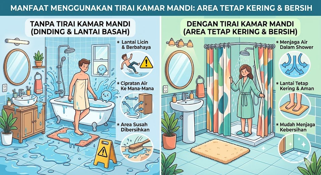 Banyak kamar mandi modern yang dilengkapi dengan kabinet kayu, cermin dengan bingkai logam, atau rak penyimpanan handuk. Paparan air secara terus-menerus melalui cipratan saat mandi dapat merusak material tersebut dalam jangka panjang. Kayu bisa melapuk, logam bisa berkarat, dan cermin bisa mengalami korosi pada bagian tepinya. Tirai kamar mandi berfungsi sebagai pelindung investasi furnitur Anda dengan memastikan air tetap berada di zona yang seharusnya. Dengan investasi yang relatif sangat murah untuk selembar tirai, Anda dapat menghemat biaya perbaikan atau penggantian furnitur dapur dan kamar mandi yang mungkin rusak akibat paparan air yang tidak terkendali.